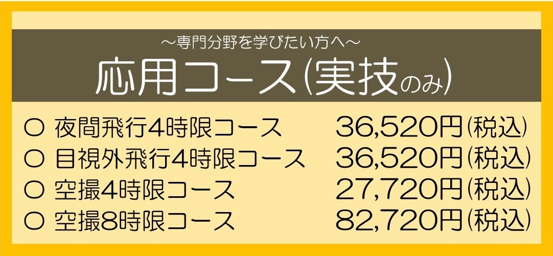 ※当コースは、「飛行記録証明書」「無人航空機技能講習修了証」を発行致しません。予めご了承ください。