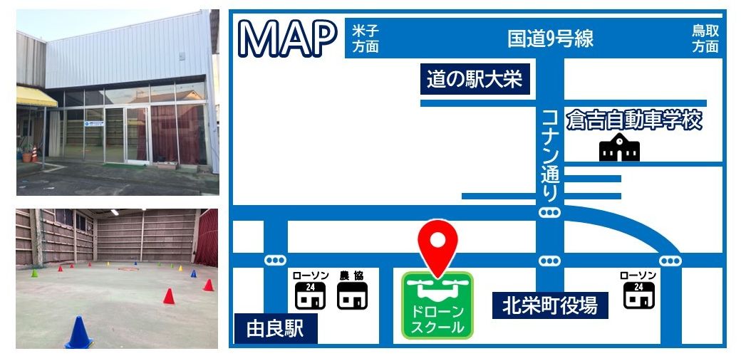 講習場所は自動車学校ではなく、JA鳥取中央「大栄支所」の東側の建物です。入口の「ドローンスクール」のロゴが目印です。農薬散布の屋外飛行練習は「北条運動場」へ移動して行います。