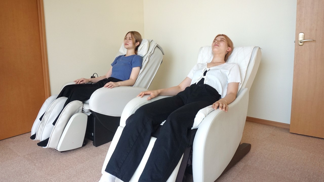 フィットネスルーム同様、リラックスルームも校内食堂「アイビー」の2Fに有ります。 2台のチェアに腰掛けて、瞑想にふけるも良し・・・。