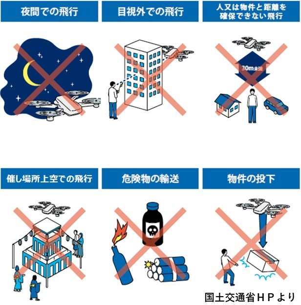 - 他人に迷惑を及ぼすような方法で飛行させないこと